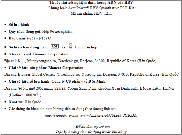 - Hãng sản xuất, nước sản xuất: Bioneer Corporation, Hàn Quốc
