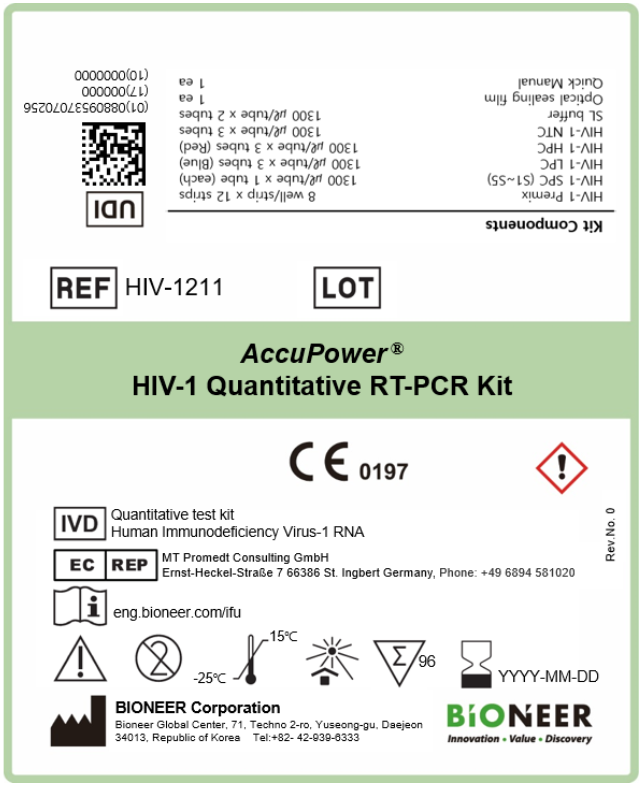 Bộ kit AccuPower® HIV-1 Quantitative RT-PCR là kit chẩn đoán in-vitro, được thiết kế để định lượng RNA của vi rút gây suy giảm miễn dịch ở người (HIV) týp 1 trong huyết tương với chất chống đông EDTA thông qua phản ứng tổng hợp chuỗi theo thời gian thực (PCR) trên Hệ thống ExiStationTM Universal MDx.