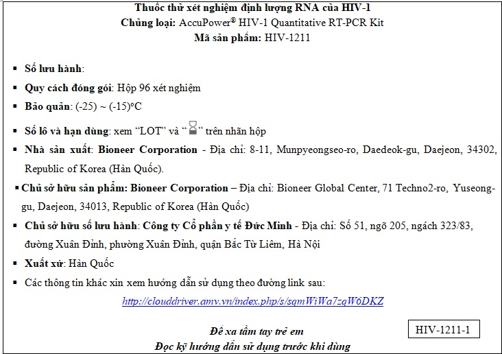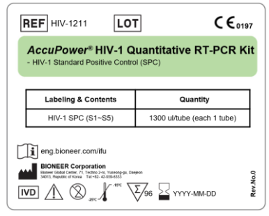 Bộ kit AccuPower® HIV-1 Quantitative RT-PCR được sử dụng cùng với các triệu chứng lâm sàng và các dấu hiệu khác để theo dõi tiên lượng bệnh hoặc điều trị bằng thuốc kháng vi rút bằng việc đo tải lượng vi rút HIV-1. Kiểu gen HIV-1 thuộc nhóm M, N, O trong khoảng nồng độ 8.0 Log10 IU/ml tới 1.70 Log10 IU/ml. Bộ kit này không được sử dụng để kiểm tra sàng lọc cho nhiễm HIV-1 trong các mẫu lâm sàng bao gồm máu và các sản phẩm máu. Bộ kit này không nhằm mục đích chẩn đoán lâm sàng ban đầu cho nhiễm HIV-1, như sàng lọc HIV-1.