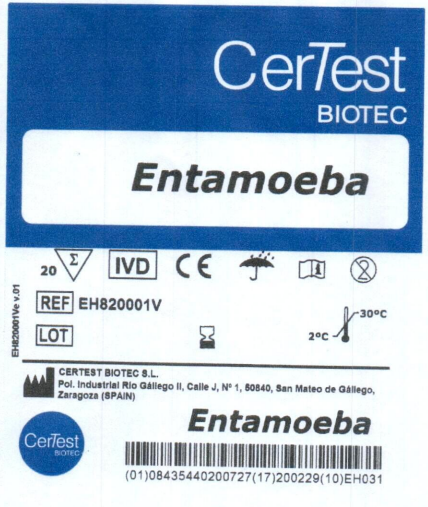 Xét nghiệm dạng khay thử CerTest Entamoeba là kỹ thuật sắc ký miễn dịch pha rắn cho mục đích phát hiện định tính Entamoeba histolytica và Entamoeba dispar trong những mẫu phân. CerTest Entamoeba là kỹ thuật đơn giản và là xét nghiệm sàng lọc với độ nhạy cao hỗ trợ cho việc chẩn đoán bệnh do amip gây nên.