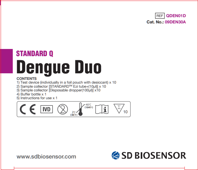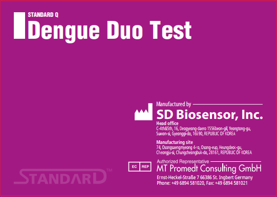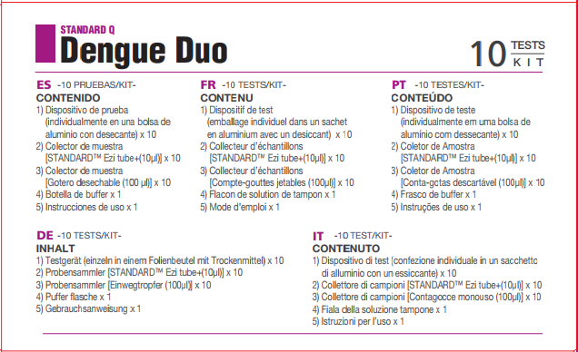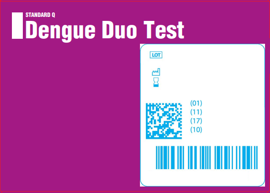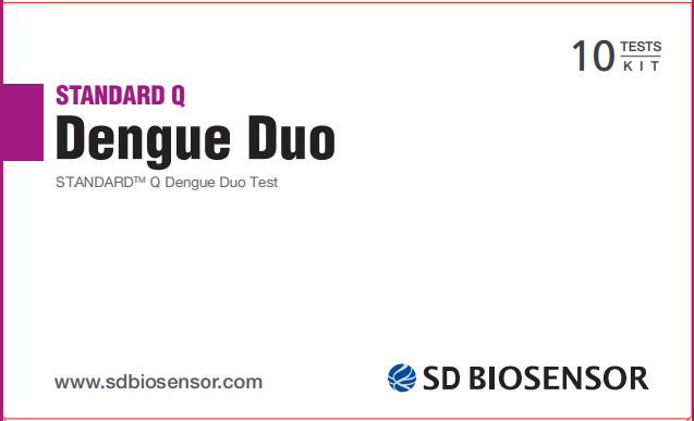 STANDARD™ Q Dengue Duo Test là một xét nghiệm sắc ký miễn dịch để phát hiện định tính và phân biệt kháng nguyên Dengue NS1 và các kháng thể IgM/IgG chống lại vi rút Dengue trong mẫu huyết thanh, huyết tương hoặc mẫu máu toàn phần người.