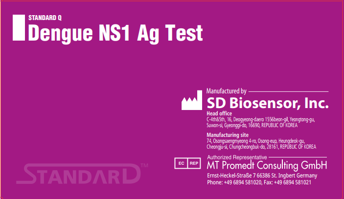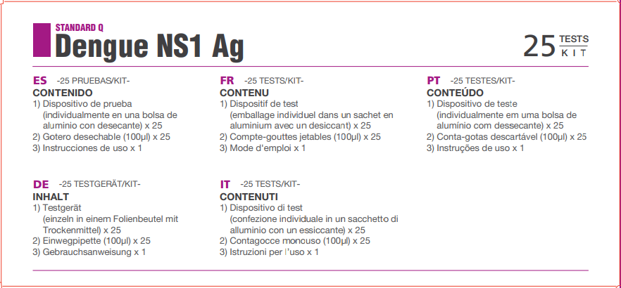 STANDARD™ Q Dengue NS1 Ag Test là một xét nghiệm sắc ký miễn dịch để phát hiện các kháng nguyên NS1 của vi rút Dengue trong huyết thanh, huyết tương hoặc mẫu máu toàn phần người. Bộ xét nghiệm này chỉ sử dụng trong chẩn đoán in vitro cho mục đích chuyên môn. Xét nghiệm chỉ cung cấp kết quả sàng lọc ban đầu.