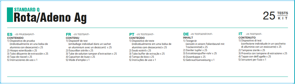 STANDARD™ Q Rota / Adeno Ag Test là xét nghiệm miễn dịch nhanh, định tính để phát hiện kháng nguyên Rotavirus và kháng nguyên Adenovirus trong mẫu phân của người. Xét nghiệm này được sử dụng trong chẩn đoán in vitro và được chỉ định để hỗ trợ chẩn đoán sớm nhiễm Rotavirus nhóm A và Enteric-Adenovirus. Xét nghiệm chỉ dành cho mục đích chuyên môn, như một xét nghiệm sàng lọc ban đầu.