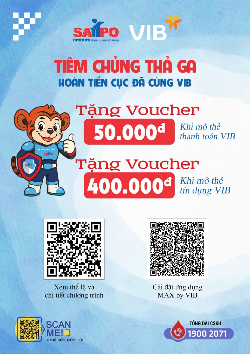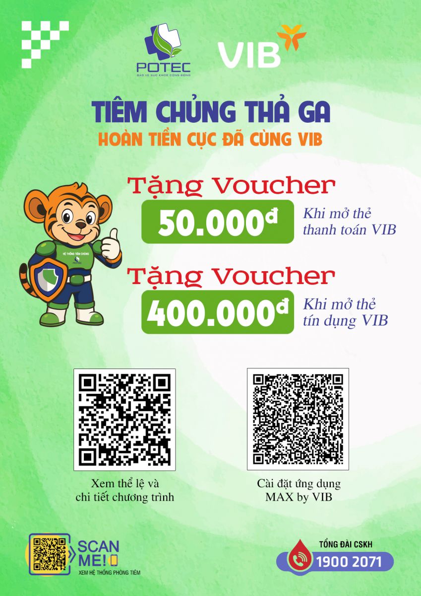Để mang đến trải nghiệm dịch vụ thuận tiện và nhiều lợi ích hơn cho khách hàng, hệ thống tiêm chủng Safpo/Potec đã hợp tác cùng Ngân hàng Quốc tế VIB triển khai chương trình ưu đãi dành riêng cho khách hàng đến tiêm chủng.